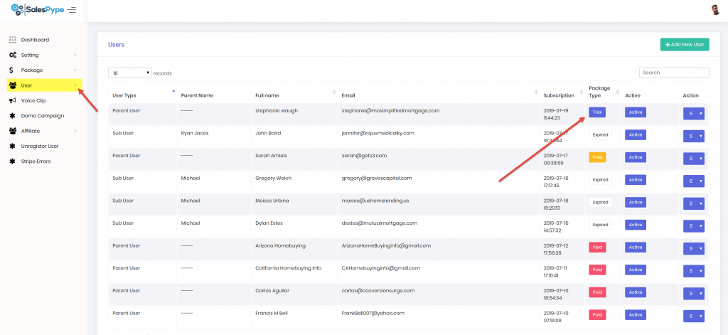 Login to the admin panel of SalesPype and check for any new users that have started a trial.